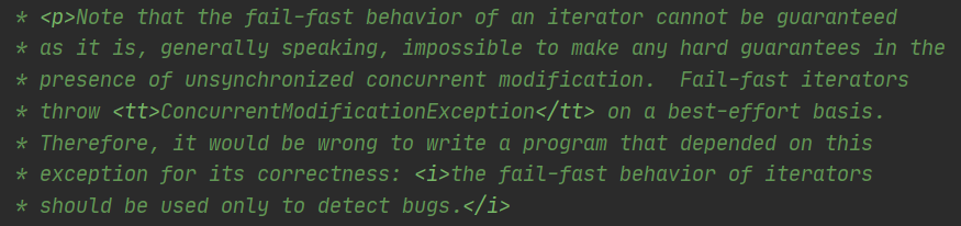 意思就是说:迭代器的快速失败行为是不一定能够得到保证的,一般来说,存在非同步的并发修改时,不可能做出任何坚决的保证的。但是快速失败迭代器会做出最大的努力来抛出ConcurrentModificationException。因此,编写依赖于此异常的程序的做法是不正确的。正确的做法应该是:迭代器的快速失败行为应该仅用于检测程序中的bug.