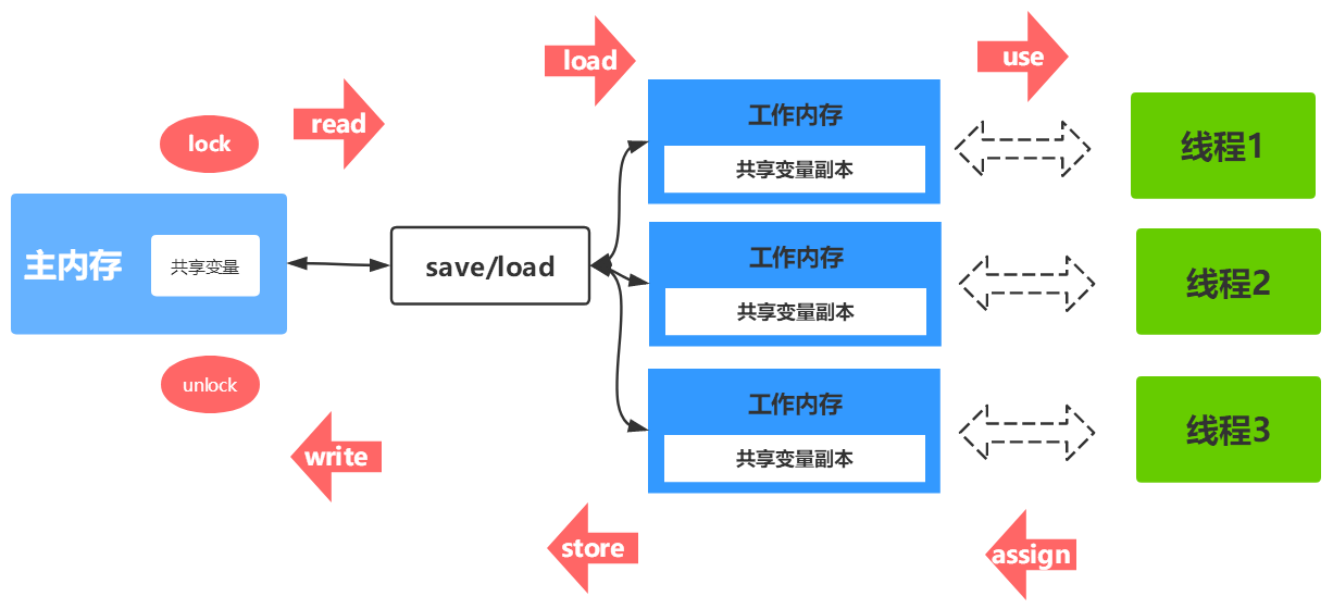 (4)load(载入):作用于工作内存的变量,它把read操作从主内存中得到的变量值放入工作内存的变量副本中