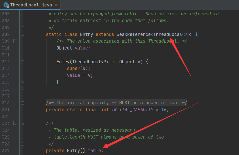ThreadLocalMap内部维护着Entry数组,每个Entry代表一个完整的对象,key是ThreadLocal本身,value是ThreadLocal的泛型值: